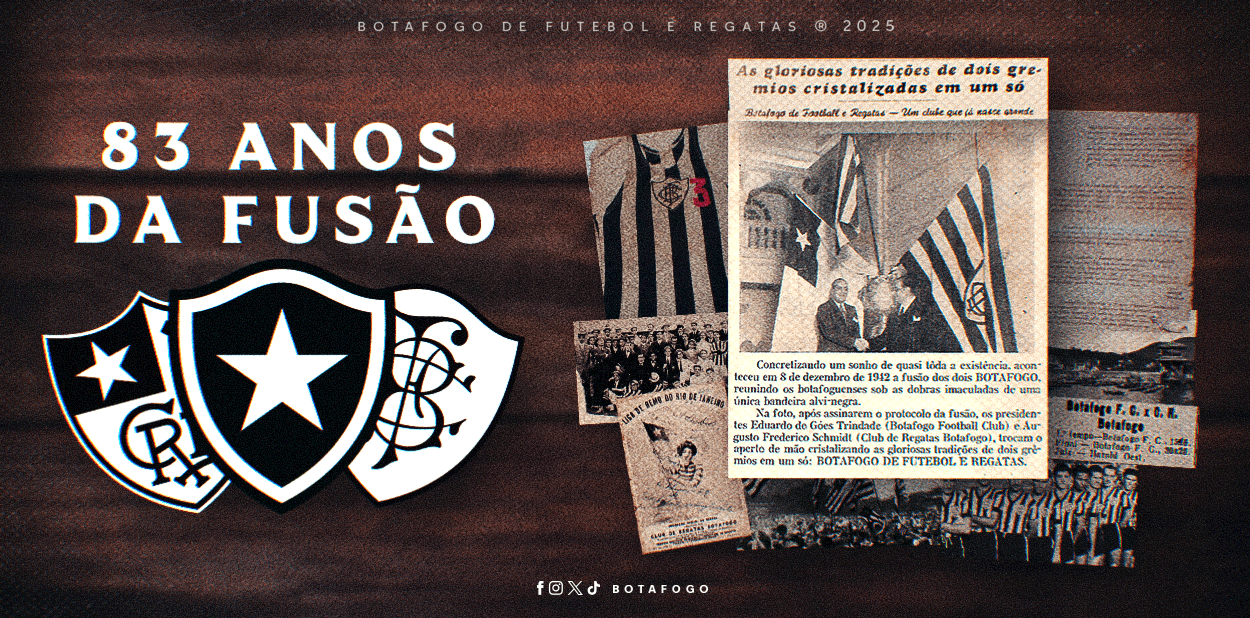 Dia 08 de Dezembro é uma data muito especial para todos os Botafoguenses. Além de marcar o título do tricampeonato Brasileiro de 2024 e da celebração de Nossa Senhora da Imaculada Conceição, padroeira do Clube, a data também marca o aniversário de 83 anos da fusão entre Botafogo Football Club e o Clube de Regatas Botafogo, que oficializou o nascimento do Botafogo de Futebol e Regatas.