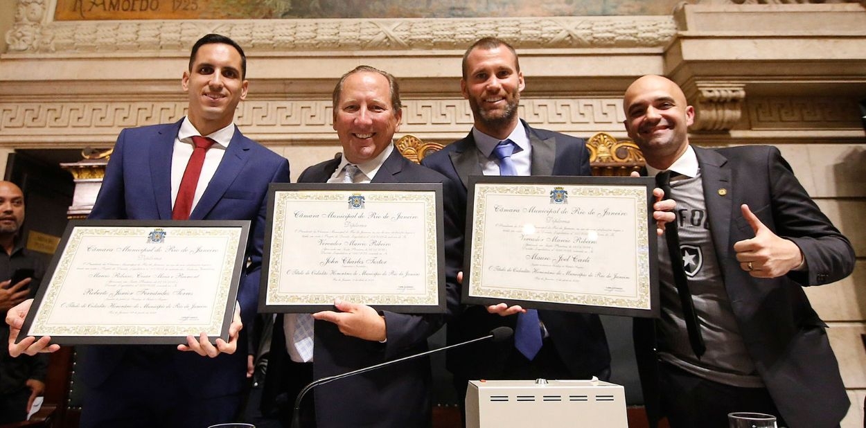 Agora é oficial: Joel Carli, Gatito Fernández e John Textor são os mais novos cidadãos cariocas. Em cerimônia realizada na noite desta quinta-feira, na Câmara Municipal, os representantes alvinegros receberam o título e contaram com animada festa da torcida. A solenidade também contou com a presença do ídolo Jairzinho e do Presidente Durcesio Mello, que tiveram seus nomes cantados pelos botafoguenses.