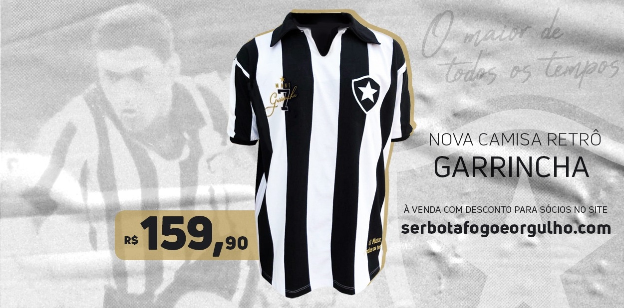 A camisa retrô de Garrincha custa R$ 159,90 e já está à venda no site https://www.serbotafogoeorgulho.com/garrincha . Sócios do Botafogo receberão cupom de desconto por e-mail.