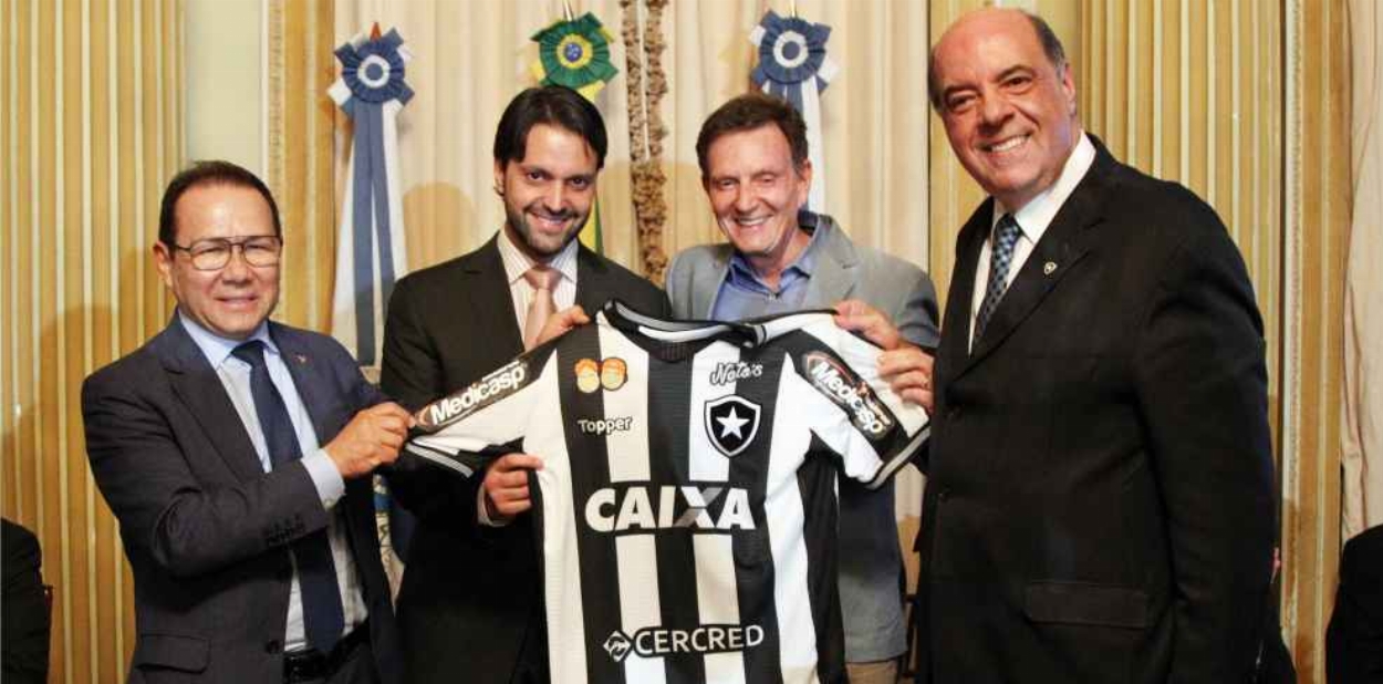 O Botafogo de Futebol e Regatas e a Caixa Econômica Federal assinaram na tarde desta quarta-feira o novo contrato de patrocínio. O Presidente do Botafogo, Nelson Mufarrej, e o Presidente da Caixa, Nelson de Souza, selaram a parceria em evento realizado no Palácio da Cidade, com a presença do Ministro das Cidades Alexandre Baldy e do Prefeito Marcelo Crivella. O acordo vai até fevereiro de 2019.