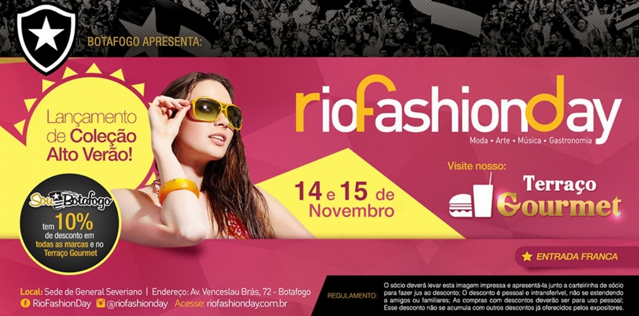 Após o grande sucesso da primeira edição em Botafogo, o evento de moda Rio Fashion Day está de volta a General Severiano. Nos dias 14 e 15 de Novembro, as 80 melhores marcas da moda lançarão suas coleções de Alto Verão e, ainda, o Terraço Gourmet com os novos chefs da cena carioca, com receitas inovadoras, levando o melhor da culinária brasileira, americana, italiana, japonesa, tailandesa e cervejas artesanais!