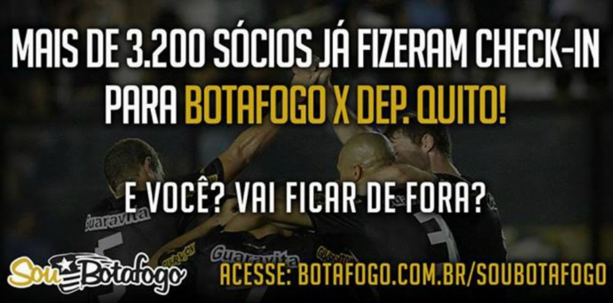 Os sócios dos planos "Glorioso" e "Ninguém Cala" que desejarem ir na partida Botafogo x Deportivo Quito terão que realizar obrigatoriamente o Check-In para garantir seu lugar. O procedimento será adotado em todos os jogos de mando do Glorioso e visa organizar o acesso do sócio ao estádio e otimizar a gestão dos ingressos, priorizando sempre o espetáculo.