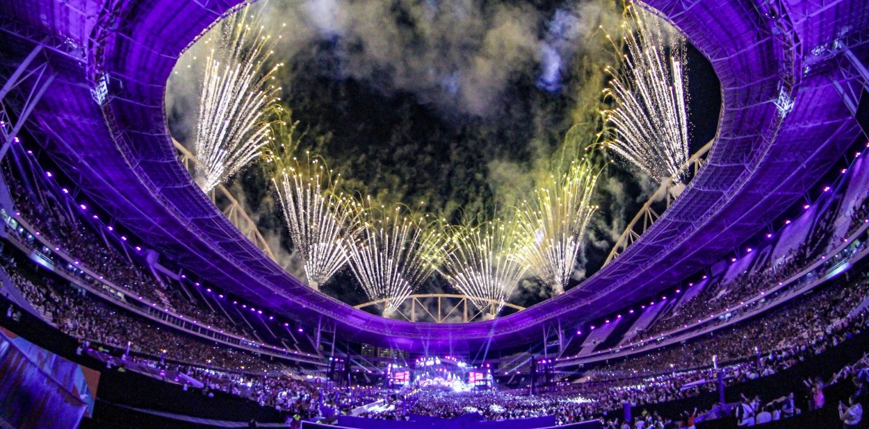 A abertura foi marcada por uma espetacular queima de fogos em 360º ao redor do estádio, acompanhada por um incrível show de luzes e drones que reproduziam símbolos icônicos da cidade do Rio, como o Cristo Redentor e o Pão de Açúcar.